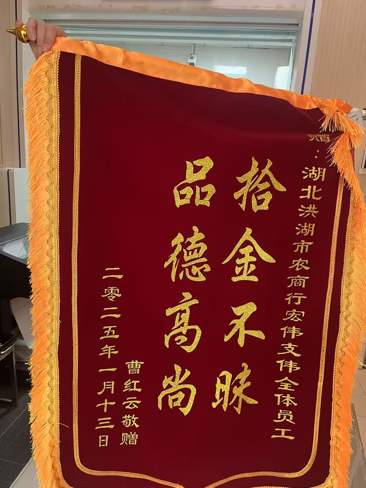 金融文化参讯-湖北(张敏)近日,客户曹女士将一面印有“拾金不昧,品德高尚”的锦旗送到了洪湖农商行宏伟支行,用最质朴的方式对支行工作人员拾金不昧、尽职尽责的高尚品质表达了感谢。