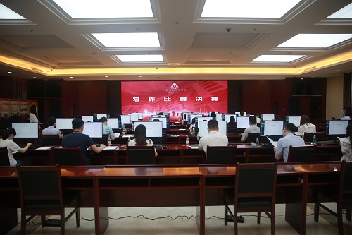 在三个小时的紧张决赛中,敲击键盘的声音此起彼伏,参赛人员现场根据给定材料进行归纳总结,拟写会议通知,撰写命题文章。比赛时间紧凑,考试内容充实,主要考察参赛人员的思想深度、归纳总结能力、公文写作能力。各参赛选手或认真审题、反复推敲;或眉头紧锁、苦思冥想;或胸有成竹、奋笔疾书。整个考场秩序井然。