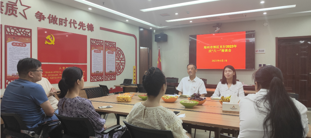 金融文化参讯-河南(李沛源)2023年8月1日上午,农发行郑州市郊区支行邀请该行复转军人举办了庆“八一”座谈会,该行党支部书记、行长张海乐同志主持了座谈,支部委员、副行长张改同志参加了座谈。