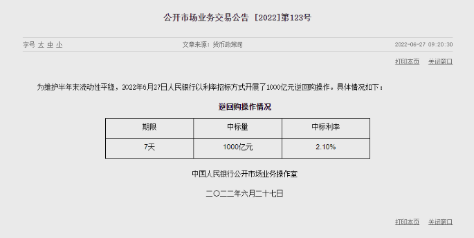 央行发布公告,为维护半年末流动性平稳,2022年6月27日