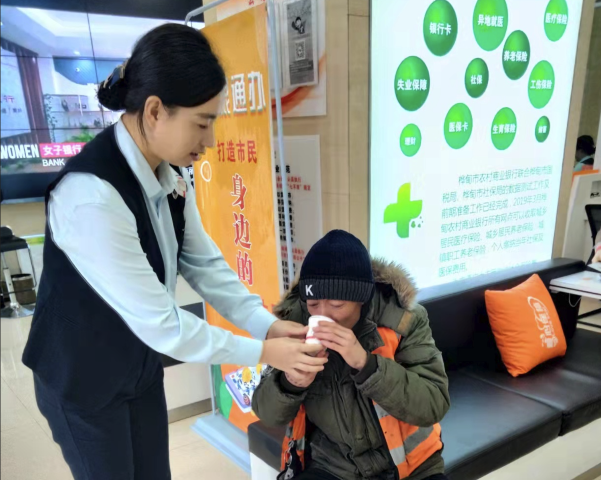 一大清早,该行市民服务中心支行的工作人员便把“爱心驿站”区域打扫干净,为座椅添置棉坐垫,准备好热水、纸杯,方便环卫工人、外卖小哥等户外工作者避寒保暖;而在该行的营业部大厅,则为“爱心驿站”配备了专职人员,提供专业而周到的服务。同时,在医药箱、热水、充电线等常用设备的基础上,新添置了微波炉,免费为扫雪的环卫工人加热午餐。“大冷天,能吃上一口热乎饭,真得感谢农商行!”环卫工人张大哥捧着热乎乎的饭盒感激地说道。