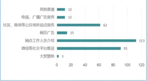 宣传方式方法落后。根据调查问卷的数据反馈可以得知(如图1所示),受调查的群体从网点人员宣传了解获知农商银行产品信息的占36.69%,从微信等社交平台推送得知的占29.55%,从公共场所设点宣传介绍得知占20.13%,从其他宣传方式获知占13.63%。由此可知:传统的上门入户、网点公告、发放宣传册、口口相传等宣传方式是农商银行主要的营销宣传途径,这种方式和途径,受员工文化程度、理解拓展能力、产品了解程度、营销技巧和抓住客户心理的影响,在一定程度上影响县级农商银行宣传口径和宣传效果。此外,农商银行营销工作由业务部门牵头,宣传工作由办公室牵头,也就是在营销和宣传没有统一归口,存在“两张皮”现象,会形成营销口径和宣传口径差异和工作推诿,同时营销宣传方式方法还是比较原始和落后,在新媒体时代,农商银行营销宣传主要靠以下三种方式方法:第一,简单粗放地置放产品标语、宣传册、条幅或X展架,虽然覆盖面广,但活动吸引力较差,存在单一性,客户多半一扫而过,似懂非懂,一般不会主动咨询;第二,利用节假日组织员工在人流密集地或进社区、走企业、访村户开展活动宣传,虽然宣传方式相对比较新颖,活动参与度高,但是覆盖面较窄,存在短期效益性,往往应接不暇,有的客户存在信息隐蔽性,不愿在公共场合咨询和谈及融资问题;第三,借助网络、电视、广播、报纸、短信等宣传媒体作为介质完成宣传工作,虽然方便、快捷、经济,但是由于缺乏互动性以及客户局限性,宣传效果一般。