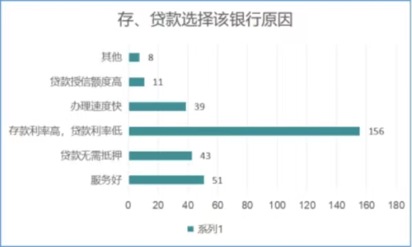 市场竞争议价能力偏弱。从调查问卷的数据显示来看(如图2所示),第一,存款客户选择银行主要是考虑收益高,贷款客户选择银行主要考虑融资成本低,所以可能存在同一客户在存贷款上不会选择同一家银行,存款存在选择多家银行,贷款选择利率低的银行。第二,服务质量和服务态度是客户的次选;第三,贷款无需抵押是第三选;从上述三个选择由此得出:银行的议价能力是留住客户和抓住客户的关键。但在这关键之中,在存款方面,农商银行处在春节期间推出高利率大额存单占有较好的优势之外,在多元化投资理财下,客户需求无法满足和具有竞争优势。在贷款方面,农商银行受资本净额和授信额度控制,只能做小做散,而大型银行有集中调度资金使用权利,更多的资金统一调度使用,额度大,薄利多销,收入相对会稳定,但他们也不缺乏在掐尖择优上做文章,在县级层面推出的低利率贷款吸引客户,抢夺优质客户,加之其品牌效应,农商银行在小和散上也受到竞争和排挤。