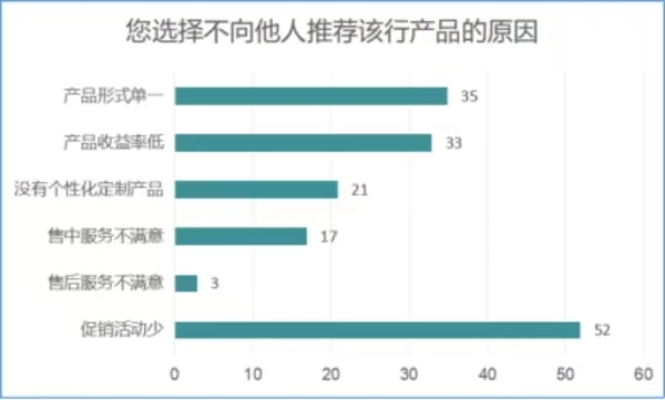 金融服务体验感有待优化。根据调查问卷结果得知(如图4所示),在接受调查的消费者中,有52.27%的人认为农商银行的相关产品促销活动少、产品收益率低、产品形式单一,还有10.56%的人对产品售中服务并不满意。这也印证了农商银行在提供金融服务这方面的工作方法仍有欠缺。在客户满足感方面,就目前的阶段来看农商银行在组织营销的过程中更加关注当下营销的营销成果,整体而言呈现出一种对营销数据成绩的过分追求,从而忽略了要从客户的角度出发去精准营销。也就是说,在过往的营销方式中,农商行更多的是将资源集中在销售端,也就是采取了一次性销售的方式,这样的销售方式有一个很大的问题就是客户无法得到满意的服务体验。而现实情况是,大部分一线员工并没有接受过系统的营销培训,尤其是一线柜员。相较于客户经理这样的营销岗位,柜员的营销能力相对要弱很多,为了完成任务,很多人都会在营销的过程中带有强烈的目的性和营销愿望,仅从产品本身出发去进行灌输式的推广,一味希望客户接受并购买产品,强调产品本身的优点,并不能将产品与客户需求相结合,如此一来就很难让客户产生获得感和满足感,甚至可能会产生反感的情绪,这就与营销目的背道而驰。比如代理保险销售类产品。