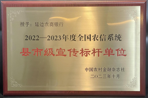 金融文化参讯-吉林(于洋)近日,吉林延边农商银行在由中国农村金融杂志社组织的“2022-2023年度全国农信系统县市级宣传标杆单位”评选活动中,经过严格的评选流程,荣获“2022-2023年度全国农信系统县市级宣传标杆单位”荣誉称号。