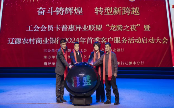 金融文化参讯-吉林(李家兴)2023年12月22日晚,由辽源市总工会、辽源农村商业银行主办,辽源市职工艺术团承办的工会会员卡普惠异业联盟“龙腾之夜”暨辽源农村商业银行2024年首季客户服务活动启动大会盛大开幕。辽源市人大副主任、总工会主席杜立智、辽源市金融办主任田秀梅、人民银行辽源市分行副行长陈海波、辽源农村商业银行董事长赵凯出席会议并为本次活动启幕。