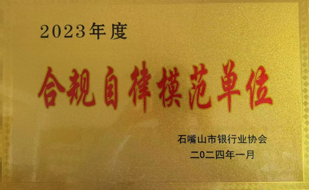 金融文化参讯-宁夏(李岩润)近日,惠农农商银行被石嘴山市银行业协会授予“2023年度合规自律模范单位”称号。