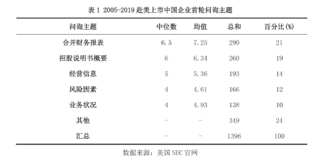 监管机构问询监管致力于促进企业实质性信息披露,故问询函主题集中于与公司利润、发展前景相关板块。基于SEC官网数据,本文对首轮问询主题作分类。在2005-2019年赴美上市78家中国企业中(除去金融业、退市及注册地为美国企业),共42家企业受询,问询主题2-11个不等,共1396个问题。其中合并财务报表、概要、风险因素、经营信息以及业务状况等占比相对较多,是投资者的关注重点。