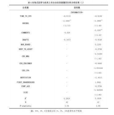 回归结果1表明INFORMATION+与ROUNDS在1%水平呈负相关,而TIME_TO_IPO、DRAFTS、COMMENTS均未通过检验;加入控制变量后,ROUNDS、COMMENTS解释变量均通过检验,t值明显改善,R2、F值均显著提高。CFO_CPA和SIZE与INFORMATION+在5%水平呈负相关;CEO_MBA与INFORMATION+通过10%水平检验,可见企业管理层水平对关键主题比例改变具有效性。