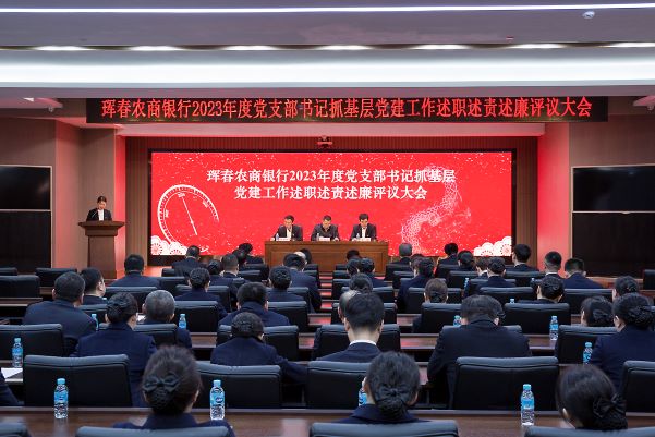 金融文化参讯-吉林(金玲演) 2月22日,珲春农商银行组织召开2023年度党支部书记抓基层党建工作述职述责述廉评议大会。该行班子成员和中层副职及以上人员、各支部书记、党务人员、群众代表共60余人参加会议,省联社督导组到会指导。