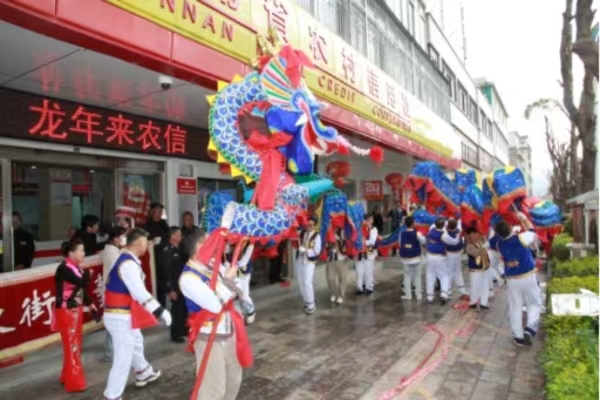 舞金龙,做灯笼,龙行大运报春晖。在凤仪支行凤中路分理处门前,大理市凤仪镇民间舞龙队精彩亮相,长龙时而腾空,时而翻滚,时而转圈,并摆出金龙摆尾、飞龙乘云等多种造型,舞出了“盛世中华、龙腾九州”的豪迈。祥龙舞动,农信人的温馨祝福也在龙吟声声中传递到千家万户;火红灯笼映初心,农信人赋能百业的使命也在元宵节激荡不息。