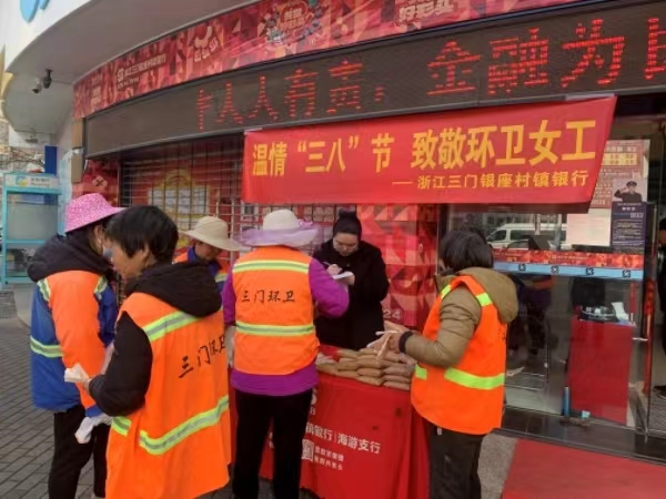 金融文化参讯-浙江(林盼盼)3月8日上午,浙江三门银座村镇银行开展“温情三八节 致敬环卫女工”活动,向节日中坚守岗位的女性环卫工人送上红糖、防水毛绒手套等礼品,致敬每一位女性劳动者。