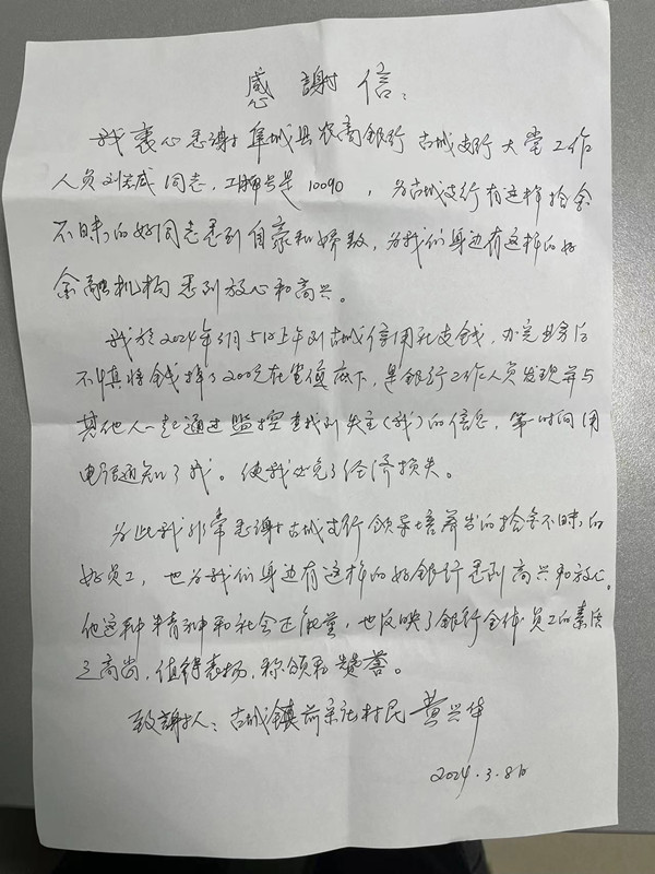 金融文化参讯-河北(代雪芹)“太感谢你们了,今天我是特意来谢谢你们的,有你们这样的银行在我们身边真是太好了……”伴随着一声声的感谢和称赞之声,一位老大爷颤巍巍地走进了阜城农商银行古城支行的营业大厅,手里拿着一封自己手写的感谢信,这是3月9日发生在阜城农商银行古城支行温情的一幕,事情的起因还要从3月5日说起……