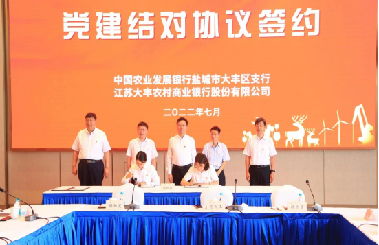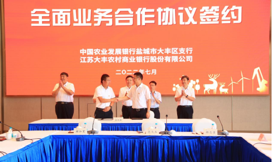 7月6日,中国农业发展银行盐城市大丰区支行与江苏大丰农村商业银行股份有限公司在大丰签署“党建结对 战略联盟 双融双促 鹿乡繁荣”党建结对暨全面合作协议。农发行盐城市分行行长刘从万、区人大主任范大玉、区金融局局长韩志勇、区人民银行行长顾加宽、区农发行行长郑彦,江苏大丰农村商业银行股份有限公司董事长卞玉叶、行长章勇等出席签约仪式。区农发行副行长严金梅和区农商行副行长罗海娟分别代表双方签署党建协议,区农发行行长郑彦和区农商行行长章勇分别代表双方签署全面合作协议,区金融局局长韩志勇主持。