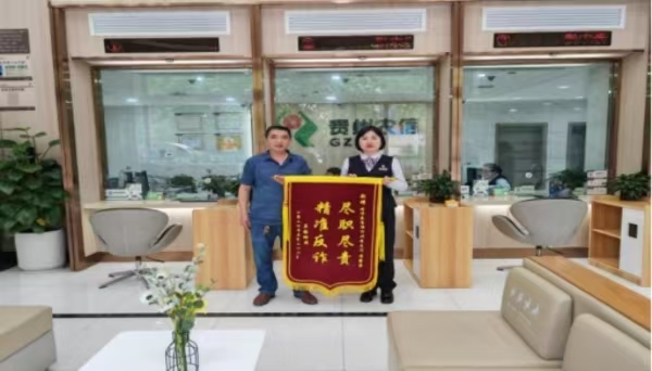 22日早上,吴先生将一面印有“尽职尽责,精准反诈”的锦旗送至湄潭农商银行兴湄支行,他感激地说道:“真是多亏了湄潭农商银行工作人员火眼金睛,如果不是你们及时帮我精准识别微信诈骗信息,我的15800元肯定被骗咯。”