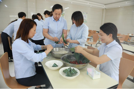 活动前,工作人员已经将糯米浸泡妥当,粽叶清洗洁净,红枣、蜜枣等材料一应俱全。员工们欢聚一堂,在轻松愉快的氛围中开始了本次活动。他们各施其能,分工明确,相互协作,将粽叶巧妙地挽成漏斗状,再将糯米和红枣填充其中,最后用线绳仔细地扎紧。每个人都将自己对节日的祝福融入了这甜美的粽子之中。在交流和分享端午节的典故与传统的同时,各种形状的粽子逐渐在桌上堆积如山,现场充满了欢声笑语,节日的气氛愈发浓厚。