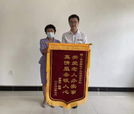 7月21日,居住在长白县十三道沟村的60多岁孤寡老人李英子来到长白联社十三道沟信用社,将一面书写着“关爱老人办实事 真情服务暖人心”的鲜红锦旗亲手递到了十三道沟信用社工作人员手中,衷心感谢十三道沟信用社员工长期以来对她在金融方面以及生活中对她的帮助、关心和照顾。