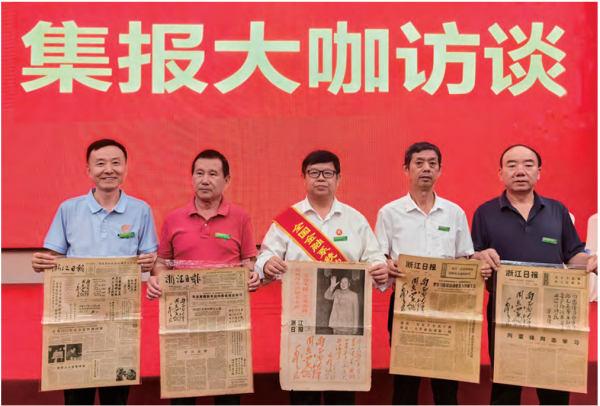 2024年8月9日至11日,中国报业协会集报分会第四届三次常务理事扩大会暨2024杭州·江南集报论坛大会在浙江省杭州市召开,来自全国19个省、直辖市、自治区的160多名集报爱好者参加。雷锋题材报纸收集爱好者、工行辽宁朝阳分行王建国以集报分会理事的身份应邀参加了大会。图为访谈结束后,与会集报爱好者纷纷走上舞台,合影留念(左三为王建国)。