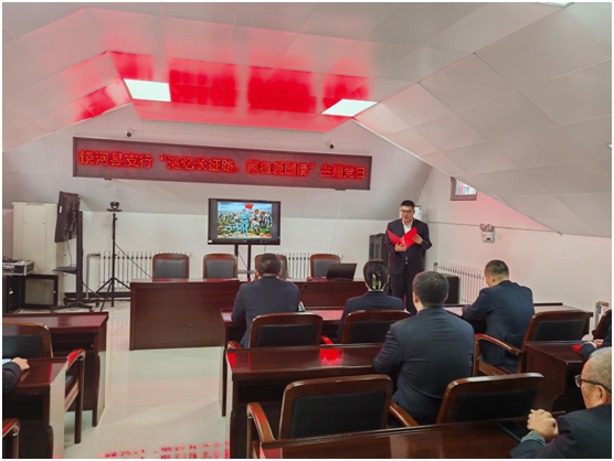 学习长征历史,传承红色基因。农发行饶河县支行团支部书记带领全行干部职工共同重温了红军长征历史,重点讲述了四渡赤水、巧渡金沙江、强渡大渡河、飞夺泸定桥等战役,引导全行上下重温长征精神的含义,以革命先辈为榜样,在服务乡村振兴的“长征路”上,矢志不移,续写新的篇章。