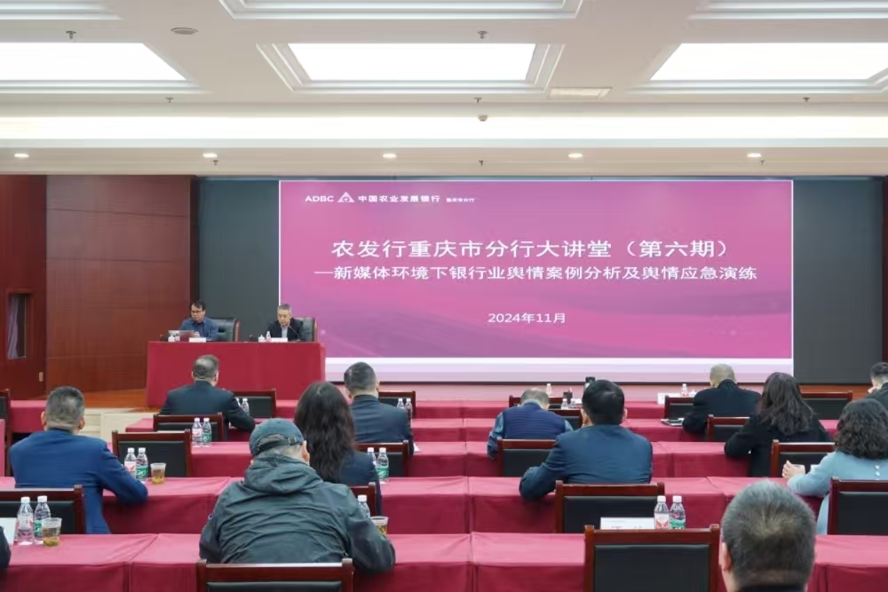 金融文化参讯-重庆(颜悦)11月22日,农发行重庆市分行举办2024年第六期“农发行重庆市分行大讲堂”,邀请新华社中国经济信息社舆情监测中心高级分析师、主任编辑王正润作“新媒体环境下银行业舆情案例分析及舆情应急演练”专题讲座。讲座以线上线下相结合的方式召开,市分行行领导、本级全体人员在现场参加,各分支机构相关人员在各分会场以视频形式参加讲座。