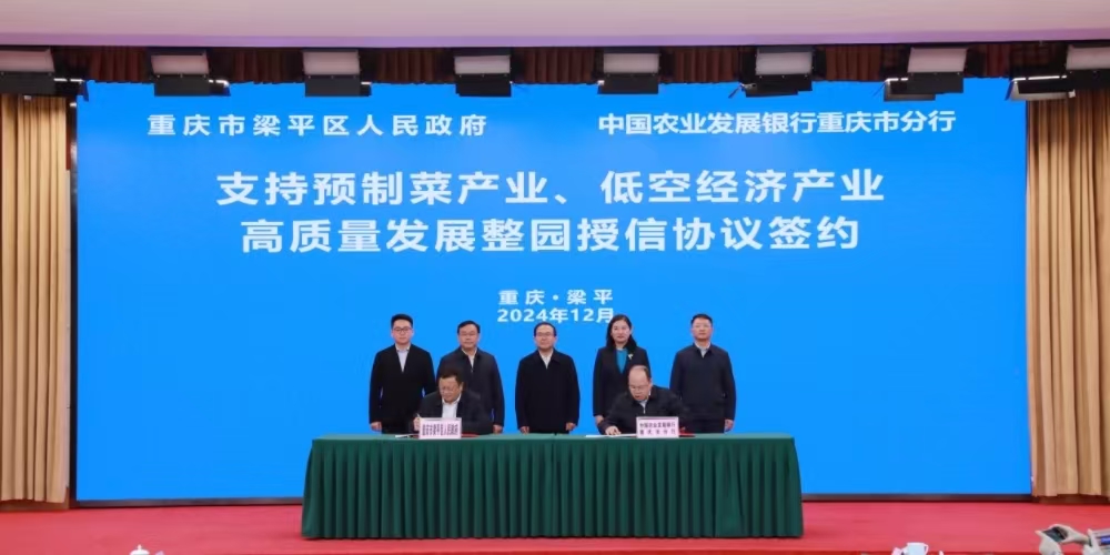 金融文化参讯-重庆(庞涛)12月4日上午,中国农业发展银行重庆市分行、重庆市梁平区人民政府签订《支持预制菜产业、低空经济产业高质量发展整园授信协议》。农发行重庆市分行党委书记、行长李楠,梁平区委书记周恩海致辞并见证签约。梁平区委副书记、区长陈孟文主持签约仪式。农发行重庆市分行党委委员、副行长周猷林,梁平区领导殷湖北、刘文洋参加。