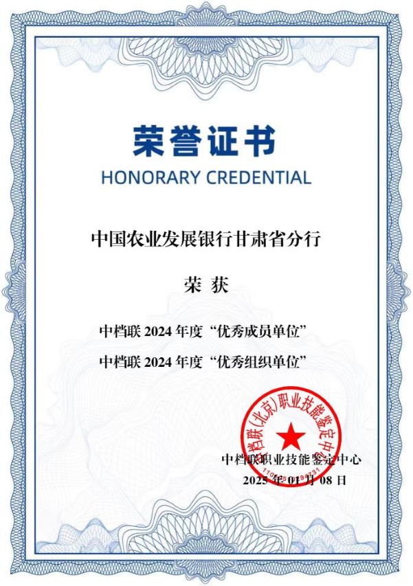 金融文化参讯-甘肃(王茂盛)近日,农发行甘肃省分行荣获中档联职业技能鉴定中心授予的2024年度“优秀成员单位”“优秀组织单位”两个奖项,20名学员获得2024年度“优秀学员”称号。