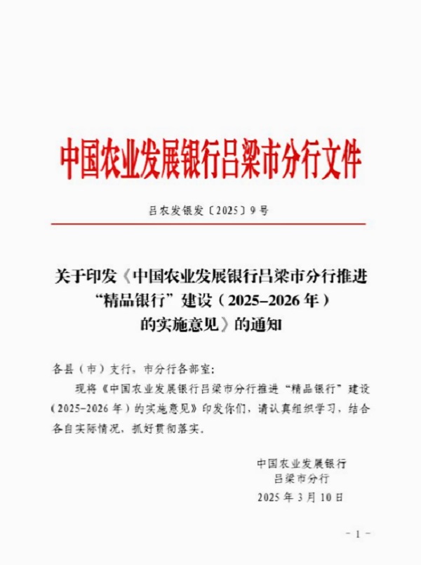 金融文化参讯-山西(高军峰)为全面贯彻省分行党委打造“精品银行”战略目标,进一步提升基层支农履职和高质量发展成效,3月10日,中国农业发展银行吕梁市分行结合实际,对标“3235”总要求,印发《推进“精品银行”建设(2025-2026年)的实施意见》(以下简称《实施意见》)。
