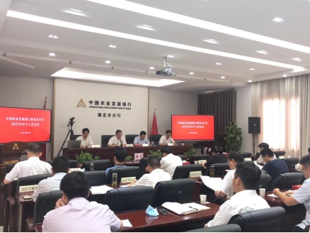 近日,农发行安徽淮北市分行召开2022年年中工作会议,传达贯彻总省行年中工作会议精神,总结上半年工作,分析当前形势,安排部署下一步重点工作。市分行党委书记、行长郑德武同志作工作报告,党委委员、纪委书记、副行长张建同志,党委委员、副行长陈智渊、邵志卓同志结合分管工作作具体安排部署。市分行中层干部、县支行班子成员及各部门负责人参加会议。