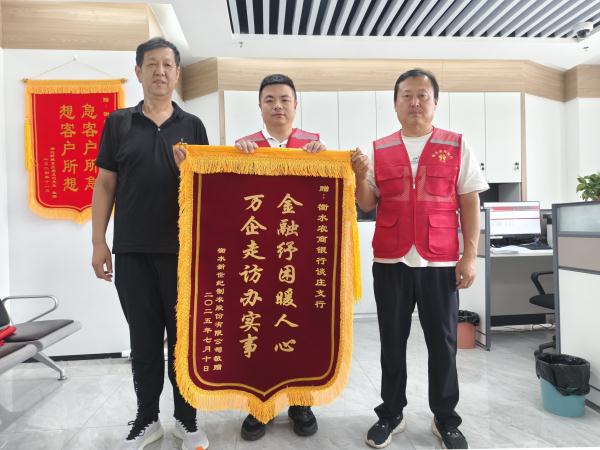 金融文化参讯—河北(刘嘉喆)7月10日,一面写有“万企走访办实事 金融纾困暖人心”的锦旗送到了衡水农商银行谈庄支行,赠送者是衡水新世纪制衣股份有限公司总经理耿铁兵。这面鲜红的锦旗,不仅是企业对农商银行精准金融支持的诚挚感谢,更是衡水农商银行“一池两新万企”行动深耕实体经济、助力小微企业成长的生动缩影。