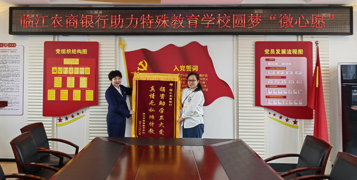 9月16日,临江市特殊教育学校工作人员将一面印有“真情无私倾特教,捐资助学显大爱”的锦旗送到了临江农商银行,感谢临江农商银行一直以来主动承担社会责任,关心关爱特殊儿童成长和教育,有力弘扬积极向上的奉献精神和传递社会正能量。