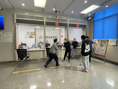 金融文化参训—四川(秦之辰)近日,在农发行四川峨眉山市支行营业大厅里,一位正在等待办理业务的人员突然拿出刀直奔柜面,就在这千钧一发之际,大厅保安迅速反应,手起防爆器具,与其他负责安全保卫的人员快步向前,共同制服“歹徒”,并有序疏散其他人员。同时,柜面工作人员迅速蹲下“报警”,动作配合默契,有效制止了这次“恶性事件”。原来这是该支行正在进行的一场安全保卫演练。