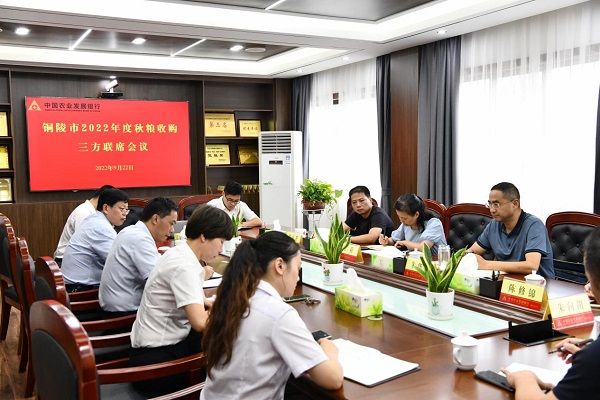 金融文化参讯—安徽(苏美子 黄文强)近日,农发行安徽铜陵市分行邀请铜陵市粮食和物资储备局、中储粮铜陵直属库有限公司召开2022年度秋粮收购三方联席会议,共同研判秋粮市场行情,会商粮食收购和政策性粮食管理过程中存在的问题,并就做好2022年度秋粮收购工作,切实加强国家政策性粮食收储和销售出库监管作出安排部署。
