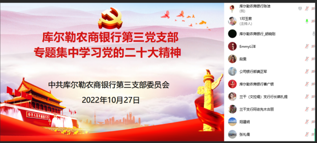 库尔勒农商银行第三党支部。库尔勒农商银行第三党支部精心组织安排该支部全体党员、入党积极分子以高度的政治责任感主动学、深入学,迅速掀起学习贯彻热潮。并引导党员干部结合思想和工作实际,谈认识、说体会、作打算,切实把思想和行动统一到习近平总书记的报告和党的二十大精神上来。