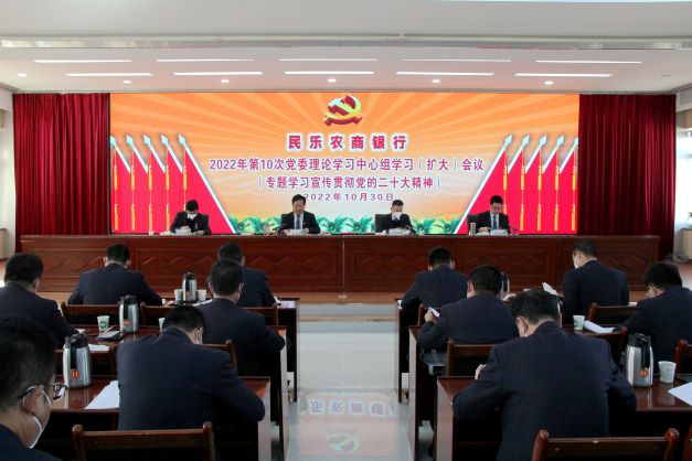金融文化参讯-甘肃(王旭邦)10月30日,民乐农商银行召开第10次党委理论学习中心组学习(扩大)会议,专题传达学习党的二十大精神、省委常委扩大会议、全省党政主要领导干部会议、甘肃农信传达学习党的二十大精神会议、张掖市党政主要领导干部会议、县委常委会(扩大)会议精神,会议由党委书记、董事长朱端正同志主持,党委班子成员,各党支部书记、各支行行长、各部门经理参加了此次会议。