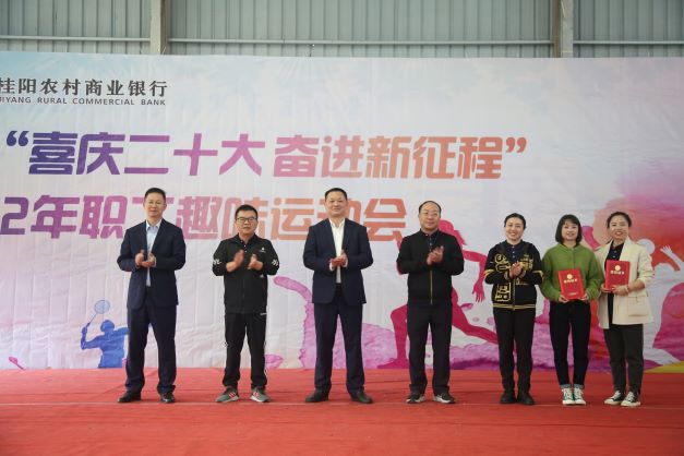 金融文化参讯-湖南(侯苏城 汤甜甜) 为庆祝党的二十大胜利召开,丰富广大职工文体生活,增强职工身体素质,增进员工团结、拼搏、进取的团队精神,凝聚奋进力量,近日,桂阳农商银行举办了以“喜庆二十大 奋进新征程”为主题的2022年职工趣味运动会,该行员工一百余人参加了本次活动。