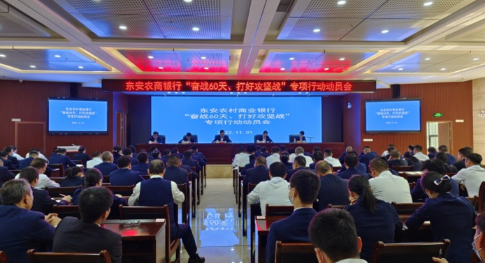 金融文化参讯-湖南(周慧娴)为进一步坚定信心,压实责任,全力突进完成2022年全年各项工作任务,11月1日下午,东安农商银行在总行十二楼会议室召开“奋战60天、打好攻坚战”专项行动动员会。会议由该行党委书记、董事长金伟主持。党委班子成员、机关全体人员、支行正(副)行长、客户经理共计130余人参加。