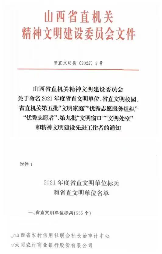 金融文化参讯-山西(王丹丹) 近日,大同农商银行荣获“省直文明单位标兵”荣誉。近年来,大同农商银行紧跟党中央、省委省政府相关指示精神,围绕省联社党委及省联社大同审计中心党委精神文明委要求,不断培育和建设“立己达人,善贷且成”的企业文化理念,进一步丰富核心价值观,用精神文明凝聚人心,用精神文明提升品牌,用精神文明增强实力,用精神文明创造价值,形成了独具特色的企业文化。