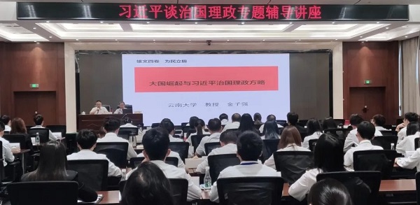 专题培训邀请云南大学金子强教授讲授课程。金教授以《大国崛起与习近平治国理政方略》为题,从国际格局、金融话语权、“强军”思想、“绿色”理念等方面,结合当前时事与焦点问题的分析,引导广大党员领导干部读原著学原文、悟原理知原义,真正做到笃信笃行求实效,善作善成勇担当。整个专题讲授主题鲜明、逻辑严密、内容丰富,既有理论高度、思想深度,又有很强的指导性、针对性,得到了全体干部员工的普遍好评。
