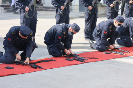 演练开始前,押运公司全体队员进行了操枪术和拆卸枪训练展示。展示操枪术时,押运队员们姿态端正,动作整齐划一,刚劲有力; 拆卸枪展示环节,全体队员们用眼罩蒙着双眼进行操作,每一个人都能在极短的时间内完成拆卸枪动作,展现出了良好的职业素养和精神面貌,赢得了全体演练人员的阵阵掌声。