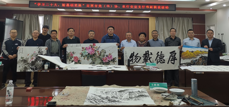 金融文化参讯-甘肃(杨荣洁)翰墨飘香,丹青溢彩。为庆祝党的二十大胜利召开,进一步加强书香农行建设,贯彻落实上级行“创新学习方式,推动党的二十大学习贯彻往深里走、往实里走”的工作要求,近日,农行安定支行携手定西市美术家协会举办了“学习二十大,翰墨颂党恩”书画联谊活动。