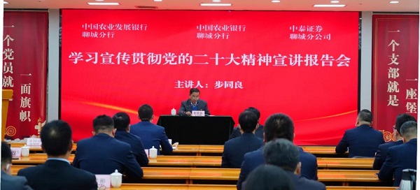 金融文化参讯-山东(李晓晴)党的二十大胜利闭幕后,农发行山东聊城市分行第一时间结合实际研究贯彻落实举措,迅速掀起学习宣传贯彻大会精神热潮。11月9日,该行与农行聊城分行、中泰证券聊城分公司联合举办学习宣传贯彻党的二十大精神宣讲报告会,各单位党委班子成员共同参与。