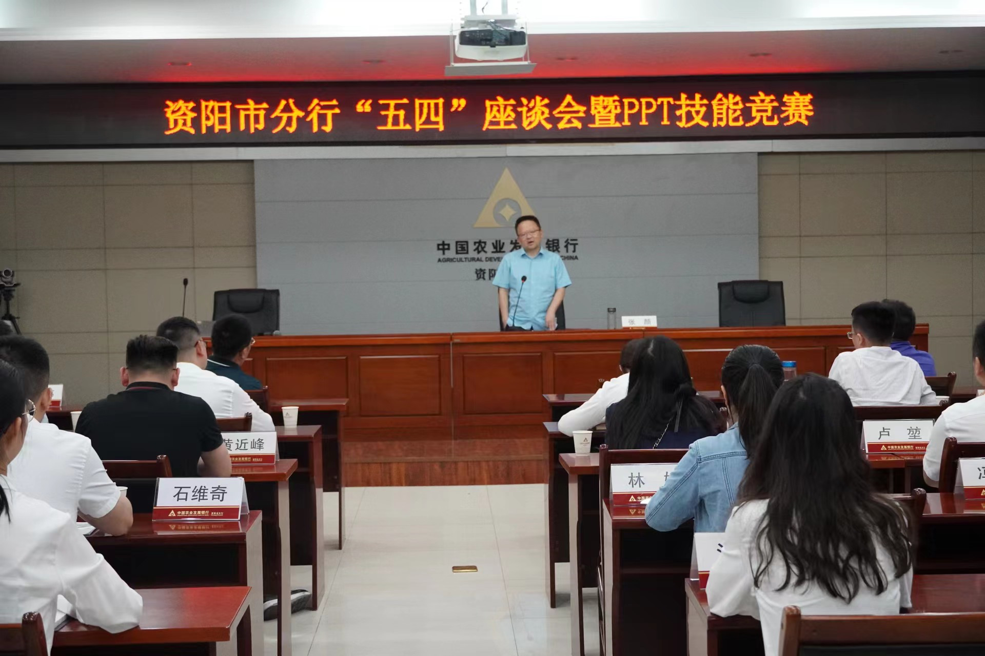 为热烈庆祝“五四”青年节,充分展示全行青年员工热爱党、热爱祖国、热爱农发行的良好精神风貌,提高青年员工与时俱进,主动学习的能力,农发行四川资阳市分行开展“五四”座谈会暨青年员工PPT技能竞赛活动。