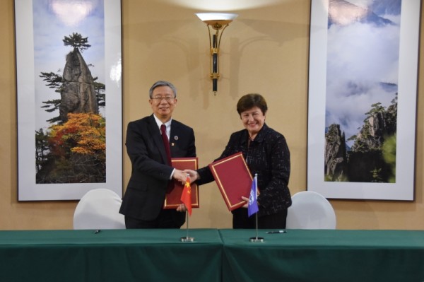 12月8日,在国务院总理李克强与六家主要国际经济组织负责人举行第七次“1+6”圆桌对话会期间,中国人民银行行长易纲会见了国际货币基金组织总裁格奥尔基耶娃。双方就全球和中国经济金融形势、中国与基金组织合作等问题交换了意见。会后,双方签署了《中国人民银行与国际货币基金组织关于能力建设合作的谅解备忘录》。