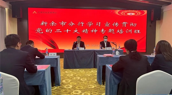金融文化参讯—江西(熊贞)党的二十大胜利召开以来,农发行新余市分行坚持把学习宣传贯彻党的二十大精神作为当前和今后一个时期的首要政治任务,迅速响应、精心组织、周密部署,以坚定的政治自觉、高昂的政治热情和强烈的责任担当,全力推动党的二十大精神走深走实。