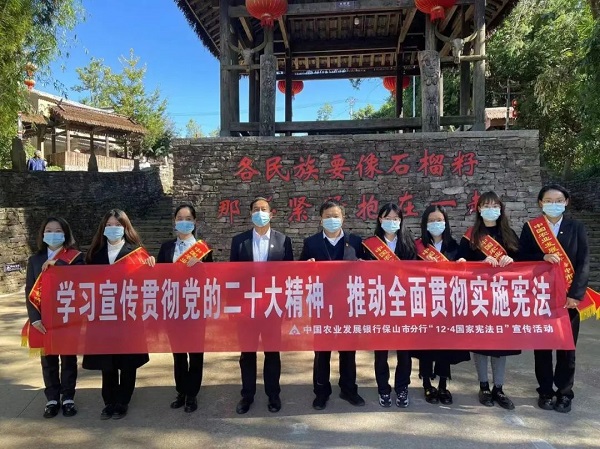 金融文化参讯—云南(保山市分行)为深入学习宣传贯彻二十大精神,落实全面依法治行要求,贯彻习近平总书记法治思想和考察云南重要讲话精神,弘扬宪法精神,助力乡村振兴,农发行云南保山市分行深入佤乡司莫拉开展以“学习宣传贯彻二十大精神,推动全面贯彻实施宪法”为主题的系列“宪法宣传日”活动。