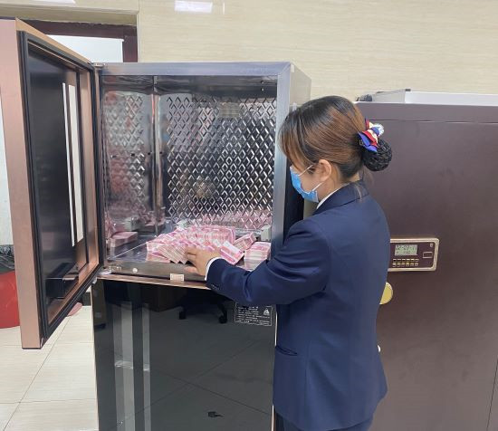三是现金消毒到位。严格落实现金收支两条线,对库存现金严格执行“先消毒、再清分“,利用紫外线消毒柜,每日入库现金全部经过紫外线消毒,同时对从医院、超市、农贸市场等渠道的回笼现金单独保管存放,单独消毒处理,单独封存上缴核算中心,并进行二次消毒处理,暂不对外流通。