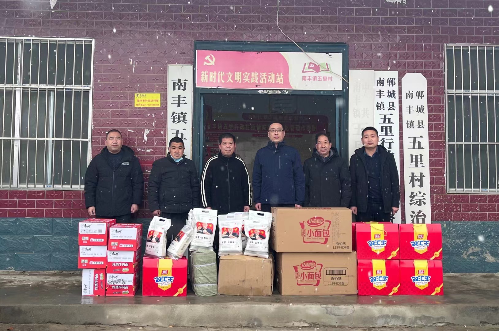 金融文化参讯-河南(李玉昆)为扎实做好巩固脱贫成果与助力乡村振兴工作,近日,郸城联社党委副书记、主任周庆中带领办公室人员冒雪到南丰镇五里行政村走访慰问困难群众,向他们致以新春佳节的美好祝福,并为他们送去火腿肠、方便面、大米等慰问品。