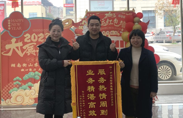 近日,衡山广轩房地产、广大地产负责人刘总将一面印着“服务热情周到、业务精湛高效”的锦旗送到衡山农商银行工业园支行表示感谢,并为工业园支行优质、高效、周到的信贷服务点赞。