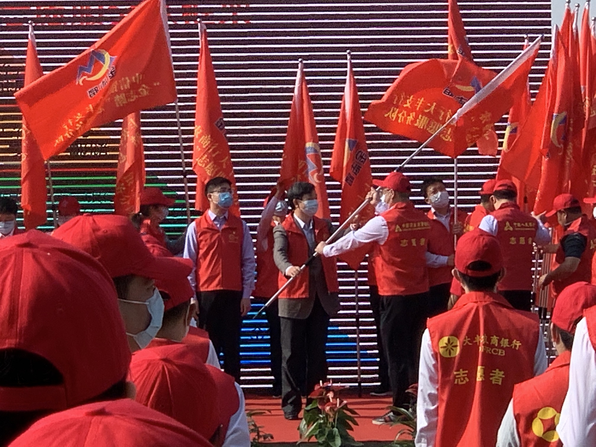 入会仪式由人民银行大丰支行副行长陈衡主持,农发行江苏盐城市大丰区支行志愿服务分队接过队旗,迎着朝阳,倡导“奉献、友爱、互助、进步”的志愿精神,树立“学习雷锋、奉献他人、提升自己”的志愿风尚,传播“人人为我、我为人人”的志愿理念,向东前进。