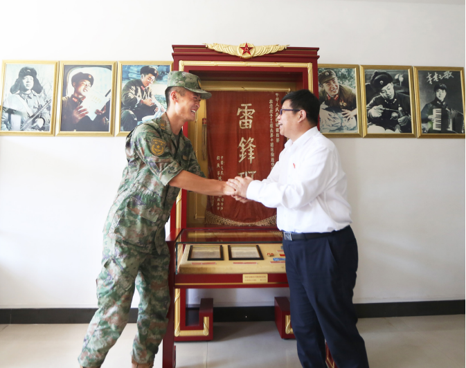 多年来,工行辽宁朝阳分行王建国坚持传播雷锋文化,播撒雷锋精神的种子,先后与 20 位“雷锋班”班长座谈交流学雷锋。图为第 27 任“雷锋班”班长牟振华与王建国在“雷锋班”热情握手。